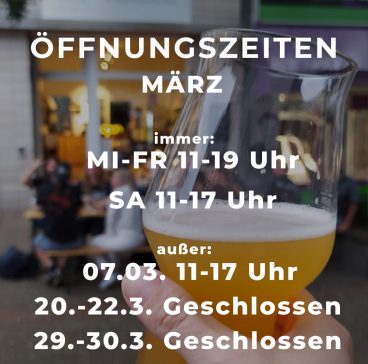 Öffnungszeiten im März Veröffentlicht am 4. März 20244. März 2024 von Bierbude In der Regel sind wir Mi- Fr von 11-19 Uhr und Sa von 11-17 Uhr geöffnet. Ausnahmen: Do 07.03. 11- 17 Uhr 20-22.03. Geschlossen 29.-30.03. Geschlossen