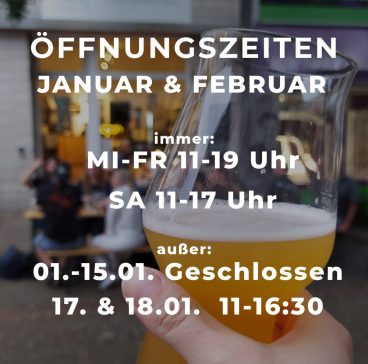 Öffnungszeiten Anfang 2024 Veröffentlicht am 22. Dezember 202320. Dezember 2023 von Bierbude Geänderte Öffnungszeiten für Januar & Februar: Mittwoch – Freitag 11-19 Uhr, Samstag 11-17 Uhr Ausnahmen: 01.-15. Januar: Komplett geschlossen. 17. & 18. Januar: 11-16:30 Uhr geöffnet